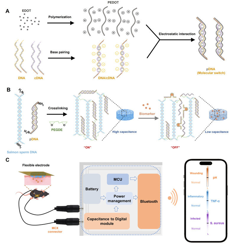 为此,同济大学胡勇教授课题组设计出PEDOT:DNA(pDNA)水凝胶及其电容传感系统,用于糖尿病伤口微环境中特异性生物标志物监测。首先,通过碱基配对原则构建生物标志物响应型亚稳态核酸双链。随后,利用静电相互作用在DNA双链上聚合PEDOT,制备PEDOT:DNA(pDNA)复合物(Scheme 1A)。pDNA中未配对碱基的伯胺基与聚乙二醇二缩水甘油醚(PEGDE)的环氧基发生亲核加成反应交联成pDNA水凝胶网络(Scheme 1B)。将该水凝胶与柔性电极、便携式电容检测器集成,通过蓝牙无线传输模块实现智能手机端实时信号采集(Scheme 1C)。概念验证阶段,研究人员选取糖尿病伤口关键病理标志物H+、TNF-α和金黄色葡萄球菌(S. aureus)响应的FNAs制备成pDNA水凝胶。无靶标存在时,pDNA保持双链结构("开启"状态),维持导电网络,表现出高介电常数和电容值;暴露于靶标后,响应序列构象转变为i-motif或适配体结构,引发双链解离("关闭"状态),破坏导电pDNA网络,降低介电常数和电容值。该系统据此将生物信号转化为可量化电容读数。通过连续电容监测可解析pH变化、炎症状态及感染情况,有效区分感染与非感染创面,以及药物治疗不同阶段的愈合进程。因此,该研究设计的新型电容式DNA生物传感系统既能揭示疾病进展机制,又能为治疗效果评估提供有价值的反馈。