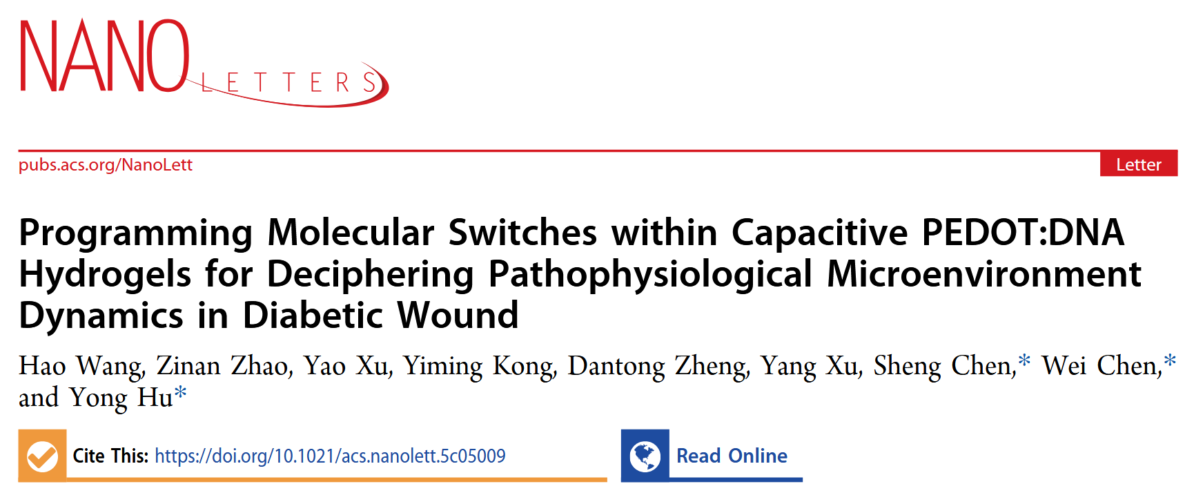 该研究成果近期以“Programming Molecular Switches within Capacitive PEDOT:DNA Hydrogels for Deciphering Pathophysiological Microenvironment Dynamics in Diabetic Wound”为题发表在《纳米快报》(Nano Letters)上。